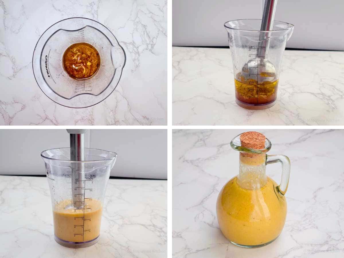 Add all ingredients to a mason jar with a tight-fitting lid. Shake vigorously until the vinaigrette looks creamy and blended. This is the simplest method and perfect if you want easy storage — just shake again before serving.